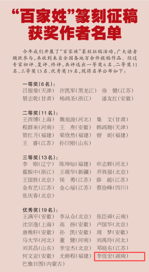 李佳宏作品荣获《中国书画报》“百家姓”篆刻征稿优秀奖。
